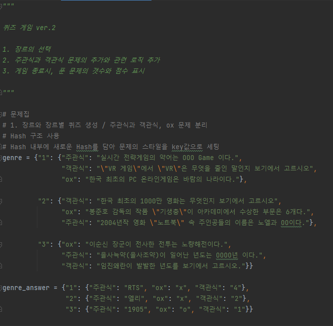 먼저 장르를 나누고 각 장르별 퀴즈를 생성하는데, 각각 주관식/객관식/ox 문제로 나뉘어 구성되어 있다.